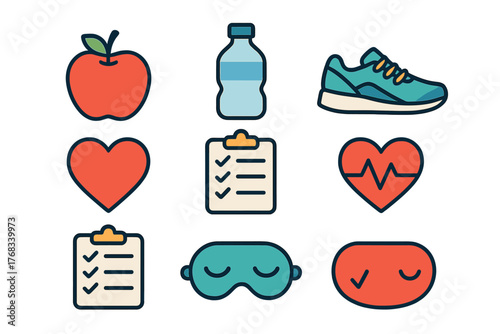 icon, healthy, lifestyle, fitness, nourishment, sleep, wellness, exercise, diet, habit, rest, routine, nubes, pulse, cardiology, water bottle, running shoe, checklist, modern, flat