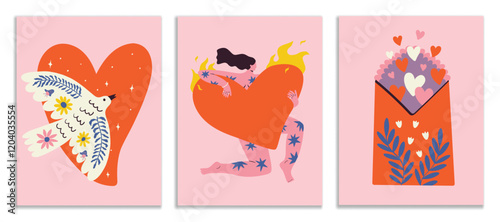 Set of love Valentines cards with woman, heart, pigeon and envelope. Vector design concept for print, postcard, poster.