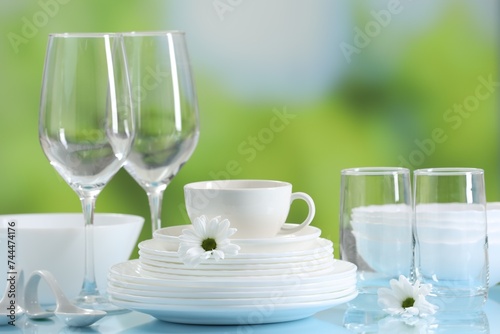 Set of many clean dishware and glasses on light blue table against blurred green background