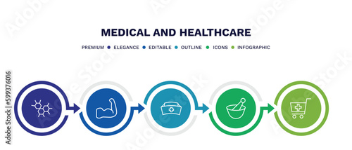 set of medical and healthcare thin line icons. medical and healthcare outline icons with infographic template. linear icons such as three hexagons cell, strong, nurse cross, medicines bowl, phary