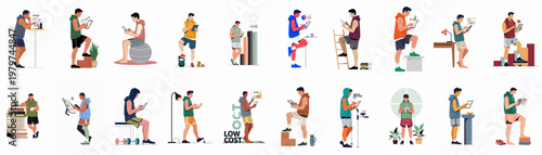 illustration, set, man, young, athletic, financial, investment, stock exchange, trading, tablet, smartphone, digital, technology, crypto, finance, chart, graph, analysing, business, wealth, management, modern, lifestyle, multitask, fitness, gym, sport, hoodie, short, casual attire, home office, professional, success, growth, money, economy, investor, analysis, datum, workspace, character, collection, vector, isolated, white background, online, productivity