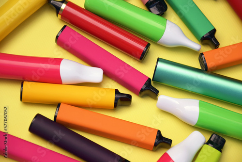 Set of multicolor disposable electronic cigarettes on a bright yellow background.