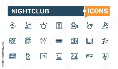 Set of Nightclub line icons. It contains symbols to pastime, vodka, cocktails, simple, art, disco and more. Minimal icons. Solid line editable vector illustration.