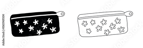 Set of Pencil Cases with Flower Patterns isolated on white background. Black Silhouette and Outline versions. Concept of School Supplies, Stationery. Zippered Pouch for Organization and Storage