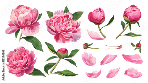 Set of peony elements including peony blooms, buds, petals, and leaves
