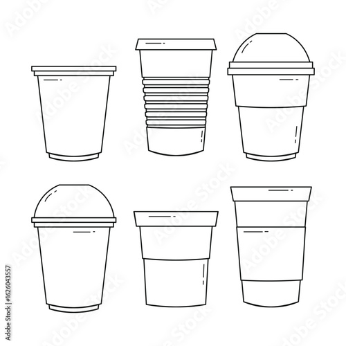 Set of plastic cup outline on white background set collection, disposable plastic cup set. Container for cold, hot drink realistic templates. Plastic cup line art doodle