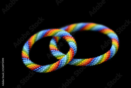 Set of rainbow mother-daughter bracelets isolated on a black background close up