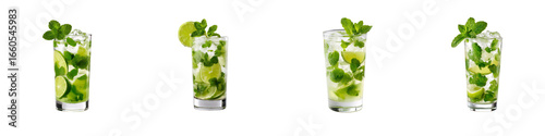 Set of Refreshing mojito cocktail with lime mint leaves and ice cubes in tall glass isolated on transparent