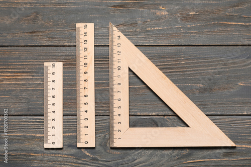 Set of rulers on wooden background
