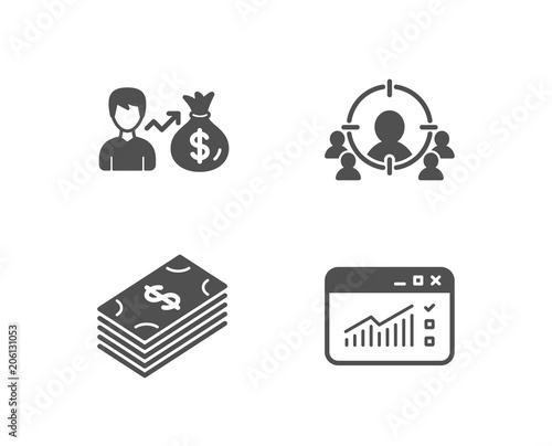 Set of Sallary, Dollar and Business targeting icons. Web traffic sign. Person earnings, Usd currency, People and target aim. Website window. Quality design elements. Classic style. Vector