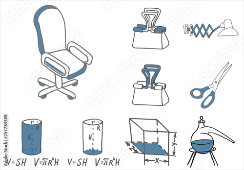 cylinder, scissors, cube, retort, college, complex, composition, construction, creative, design, doodle, line, drawing, education, element, graphic, icon, illustration, image, line, mathematic, outline, school, science, signs, single, study, symbol, university, vector, visual, white, background