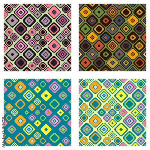 Set of seamless vector geometrical patterns. Endless background with hand drawn ornamental squares, circles. Graphic vector illustration with ethnic tribal motifs. Print for cover, fabric, wrapping.