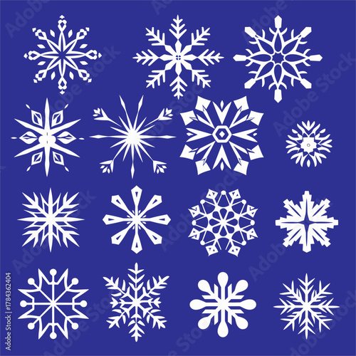 Set of sixteen white snowflake icons in various geometric shapes. Simple and intricate silhouette designs isolated on a blue background. Vector suitable for winter, Christmas, and decoration