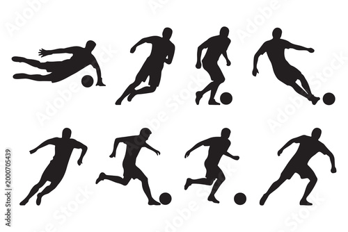 soccer, football, player, athlete, sport, action, silhouette, black, white, isolated, graphic, vector, illustration, kick, run, dripped, game, match, competition, team, training, exercise, movement, dynamic, professional, amateur, championship, tournament, goal, field, stadium, healthy, active, energy, fitness, youth, adult, male, person, figure, outline, shadow, set, collection, diverse, agility