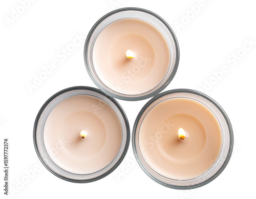 Set of three scented tealight candles in glass holders, isolated on a transparent background