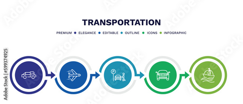set of transportation thin line icons. transportation outline icons with infographic template. linear icons such as midget car, airplane flying, parking men, auto, sailing vector.