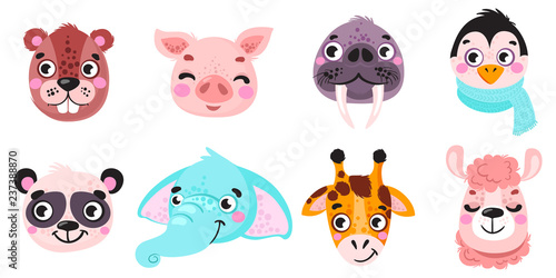 Set of vector animals in cartoon style. Cute smiley pig, panda, beaver, walrus, penguin, elephant, giraffe, llama. Cute animal faces. Hand drawn characters. Vector illustration.