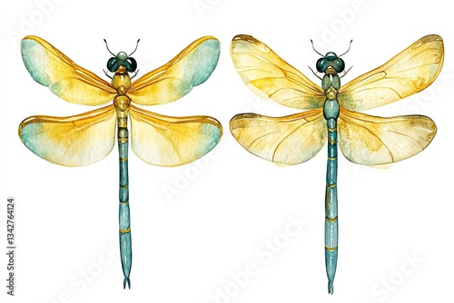 Set of watercolor dazzling dragonflies hand drawn on a white background