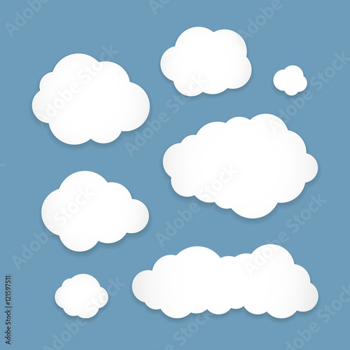 Set of white blank clouds icons for messages or web. Variety shapes, isolated on blue background. Vector illustration, EPS 10.