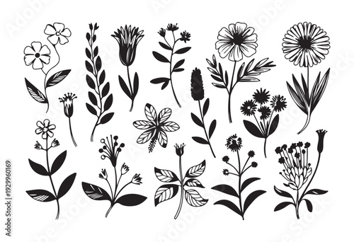 flower, wildflower, botanical, vignetting, hand-drawn, silhouette, black-and-white, floral, nature, plant, leaf, tree branch, vector, illustration, filled, decoration, design element, spring, summer, garden, meadow, herb, blossom, stem, bloom, organic, natural, foliage, graphic, vintage, elegant, simple, set, collection, drawing, monochrome, template, invitation, wedding, greeting card, banner, poster, print