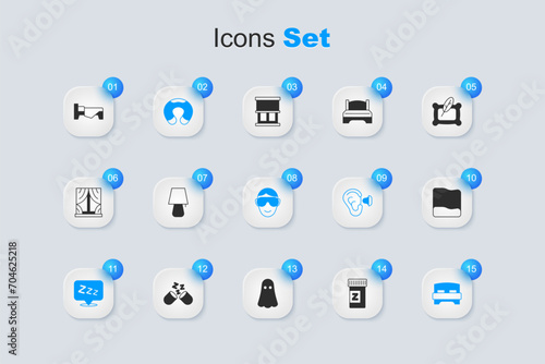 Set Sleeping pill, Table lamp, Travel neck pillow, Sleepy, Big bed, Pillow, Bed and Eye sleep mask icon. Vector