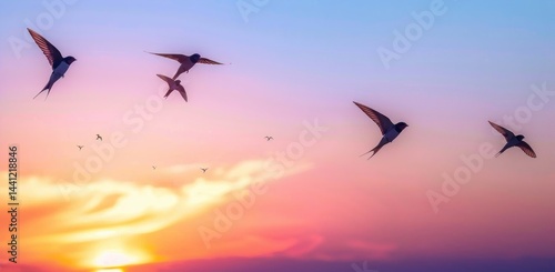 Several small birds with spread wings flying gracefully in a colorful sunset sky with warm orange, pink, and purple hues, evoking a peaceful and serene atmosphere