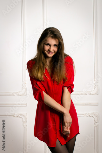 sexy, brunette, modern, woman, dress, fashion, female, red, shirt, 1, caucasian, girl, beautiful, pretty, beauty, person, people, portrait, attractive, human, young, light, studio, adult, model, body, hair, look, pose, stylish, elegant, happy, cool, fashionable, background, posing, lady, white, face, cute, expression, cheerful, casual attire, smile, joy