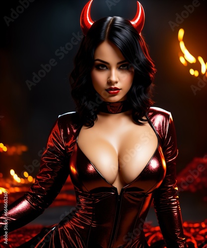 Sexy brunette woman in red leather corset and devil horns. Halloween.