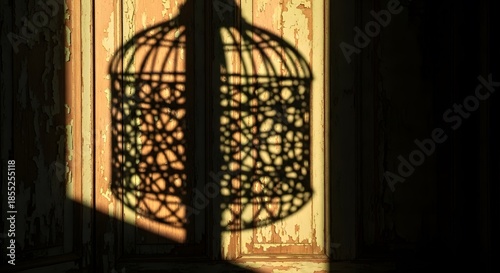 Shadow of a birdcage on a wooden wall with peeling paint in warm light