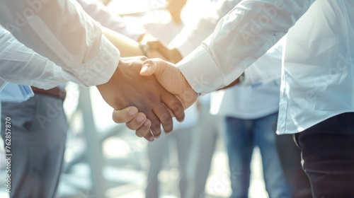 Shaking hands, interracial group of architects and engineers on meeting on blueprint for project work in, construction workers on a construction site