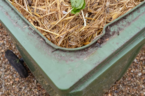 Shallow focus image of green waste including rabbit hutch straw seen in a green, local council wheelie bin ready for collection near a house.