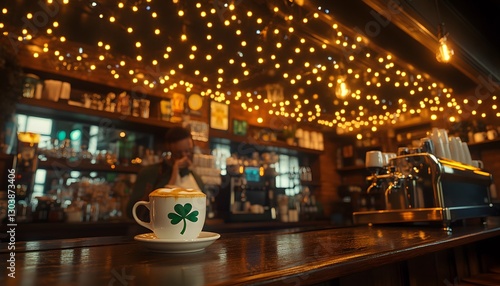 shamrock, hot drink, cafes, bar, drink, green, clover, mug, cappuccino, irish, holiday, celebration, light, interior, wood, counter, luck, festive, beverage