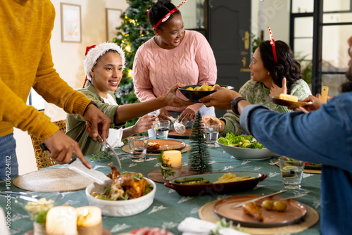 Sharing food and laughter, multiracial friends having festive christmas, at home