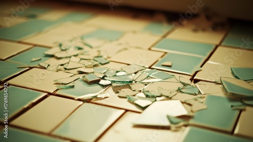 shattered, tile, broken, mosaic, destruction, ceramic, glasses, fragment, surface, square, texture, pattern, abstract, closeup, detail, design, art, composition, background, floor, angular, sharp, edge, light, shadow, cracked, ruin, damage, structure, geometry, perspective, depth, colours, beige, green, brown, horizontal, overhead, view, irregular, piece, debris, accident, risk, macro