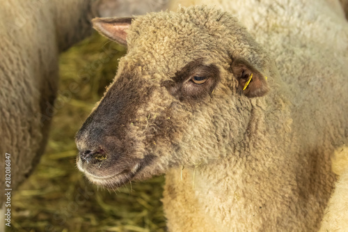 Sheep and ram at the exhibition. A young pretty ram stands in the corral and looks at the camera. Cattle breeding and livestock breeding. Sheep husbandry.