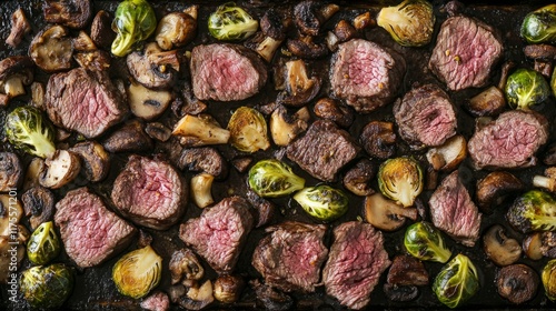Sheet Pan Beef Tenderloin with Mushrooms and Brussels Sprouts With Copy Space