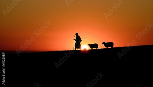 Shepherd guiding sheep at sunset with warm orange sky