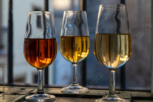 Sherry wine tasting, fino, olorosso, amontillado, cream jerez sherry fortified wine made from palomino white grape in bogedas in Jerez de la Frontera, Cadiz, Andalusia, Spain