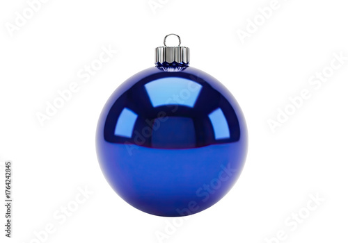 christmas, ornament, decoration, holiday, seasonal, winter, festive, celebration, shiny, glossy, reflective, blue, royal blue, deep blue, metallic, silver, cap, hanging, bauble, sphere, round, traditional, new year, party, event, glowing, bright, vibrant, clean, simple, minimalist, studio shot, isolated, cut-out, design element, template, copy space, winter holiday, christmas tree