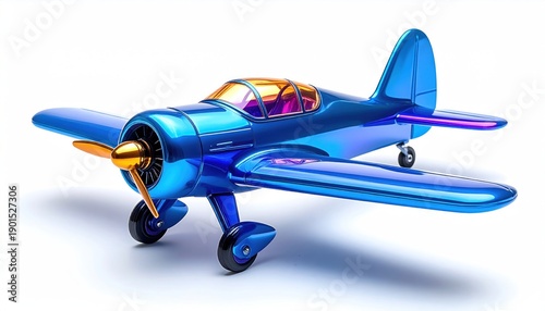 Shiny blue toy airplane with gold propeller and accents, set against a bright white background