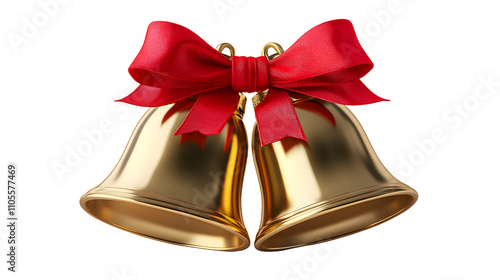 Shiny golden Christmas bells with red satin ribbon bow rendered in 3D, featuring metallic texture and polished brass finish with soft shadows against white background.