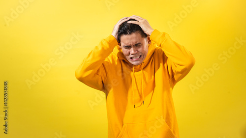 Shocked young Asian man in bright yellow hoodie holding head with both hands, mouth open wide in disbelief, posing against solid yellow background. Concept of panic, stress, or surprise