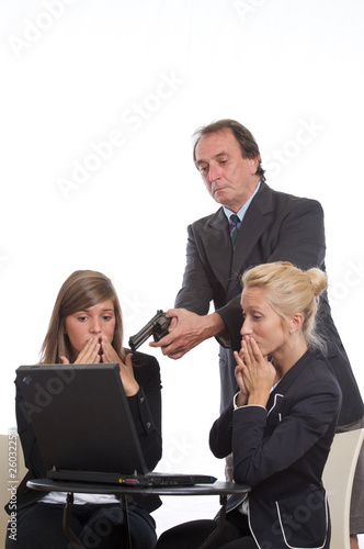 girl, gun, man, shoot, computer, fear, wonder, panic, check, threatening, cyberspace, controller, halt, jacket, necktie, elegant, dress, chair, hand-held, notebook, boss, boss, employee