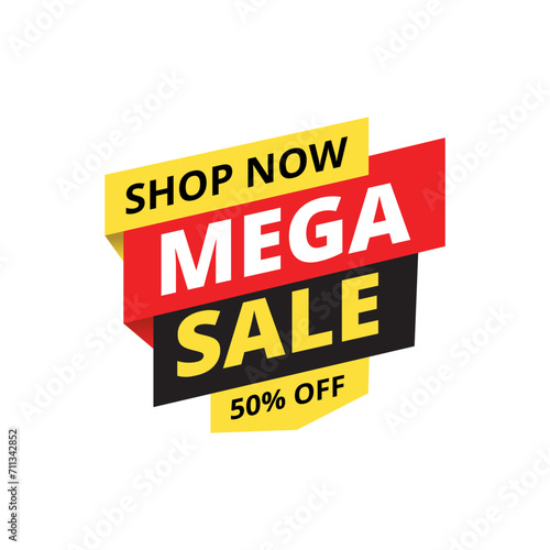 Shop now, mega sale, 50 percent off label banner for sales promotion