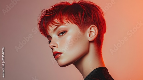 Short pixie cut on a woman with striking red hair, photographed in soft lighting, with a minimalistic studio background