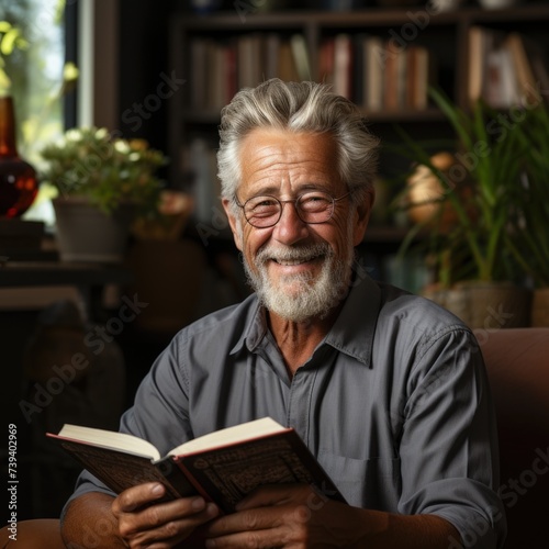 Shot of happy senior man with grey hair reading book and looking camera Generative AI