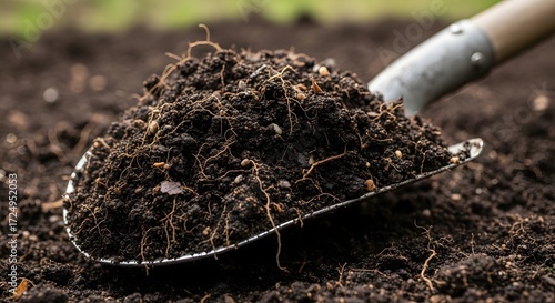 Shovel full of dark, fertile organic soil, ready for gardening, planting, and cultivating new life