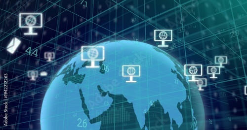 Showing stylized Earth globe rotating in network, with floating monitor icons showing globe symbols