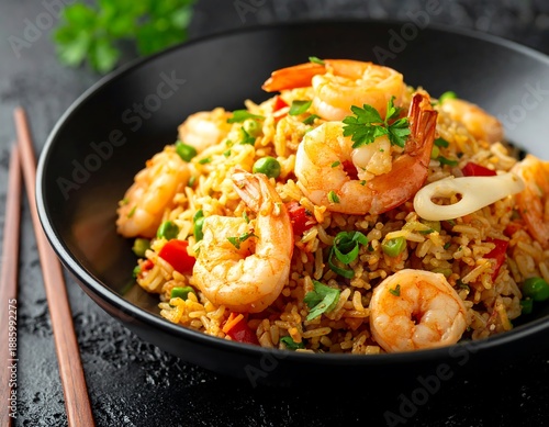 Shrimp fried rice in a black bowl with wooden chopsticks, vibrant and appetizing culinary delight