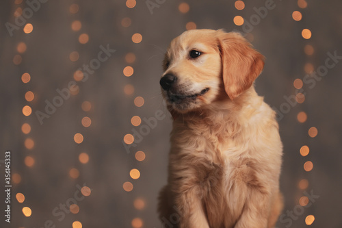 golden retriever, gold, retriever, labrador, laboratory, puppy, dog, small, little, puppy, baby animal, baby animal, baby, animal, pet, yellow, background, looking, city, light, star, happy, cute, adorable, sitting, seated, side, shy, timid, hesitant, insecure